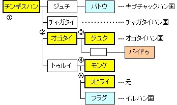 | 帝国のその後 | 【オゴタイ・ハン国(〜1301)】建国後まもなく滅亡し、チャガタイ・ハン国と元に吸収された。 【チャガタイ・ハン国(〜1370)】14世紀半ばに東西に分裂しパミール高原をはさんで互いに抗争した。1370年、西チャガタイ・ハン国のティムールが反旗を翻し、ティムール帝国を建国した。16世紀初頭には、チンギスハンの血を引くバーブルが北インドにムガール帝国を建国した。 【イル・ハン国(1260〜1353)】フラグの死後、後継者争いで分裂の危機を迎えるが、第7代ガザン・ハンが自らイスラム教に改宗して国を立て直した。宰相のラシード・アッディーンはモンゴルの歴史書集史を著わした。その後、後継者争いが激化して滅び(1353年)、その後ティムール帝国に吸収された。 |